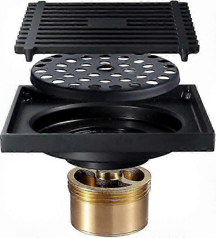 Brass construction: High-purity brass floor drain, durable in cold conditions, resistant to weak acid and medium alkaline corrosion, and handles high pressure well. Square shower drain: Measures 10.2cm in length and width, with a 4.1cm central outlet. Verify size before purchase for proper fit. Dual-filter design: Features a removable hair catcher to prevent clogs and leaks. Odor prevention: Gravity spring mechanism ensures automatic opening/closing to block unpleasant smells. Black plated finish: Scratch-resistant and stylish, complements dark matte black/bronze bathroom fixtures.