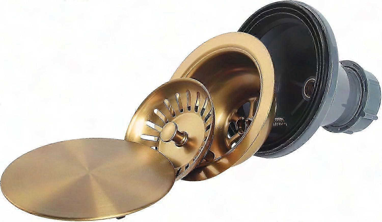 Gold Kitchen Sink Drain Made of Premium Stainless Steel,Fit for Standard Opening Size 3 1/2 Inch.Gold Sink Strainer with Decorative Cover,Provide a Neat and Modern Kitchen.Kitchen Sink Drain Assembly with Removable Basket,You can Press Down to Store Water,You can also Lift up for Running Water.Gold Kitchen Sink Drain Prevent Food and Debris From Clogging the Drainpipe,You'll Never Worry about Kitchen Waste and Odors Anymore.