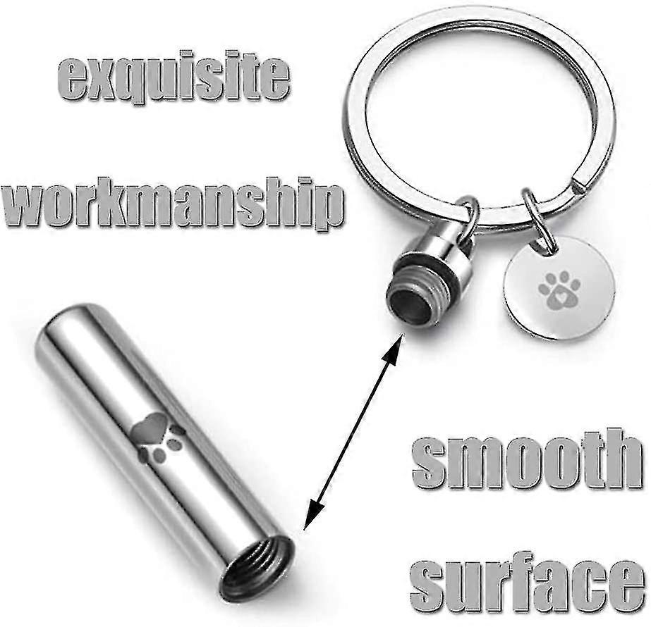 SizeThe size of our urn keychain is 8*42mm, the inner diameter of the bottle mouth is 6mm, and the weight is 15g. It is compact and easy to carry.MaterialOur urn keychain is made of high-quality stainless steel, with a smooth surface, not easy to rust, and exquisite workmanship.ApplicationOur keys are deducted as decorations, and can also be used to hold a small amount of ashes, which can be used to commemorate your dead cats and dogs.Unique DesignThe surface of our keychain is printed with exquisite dog footprints, and the design is simple and stylish, not easily outdated.Easy To UseOur pet urn keychain is easy to use, you can use the funnel to easily put the pet's ashes into the keychain and then tighten it.
