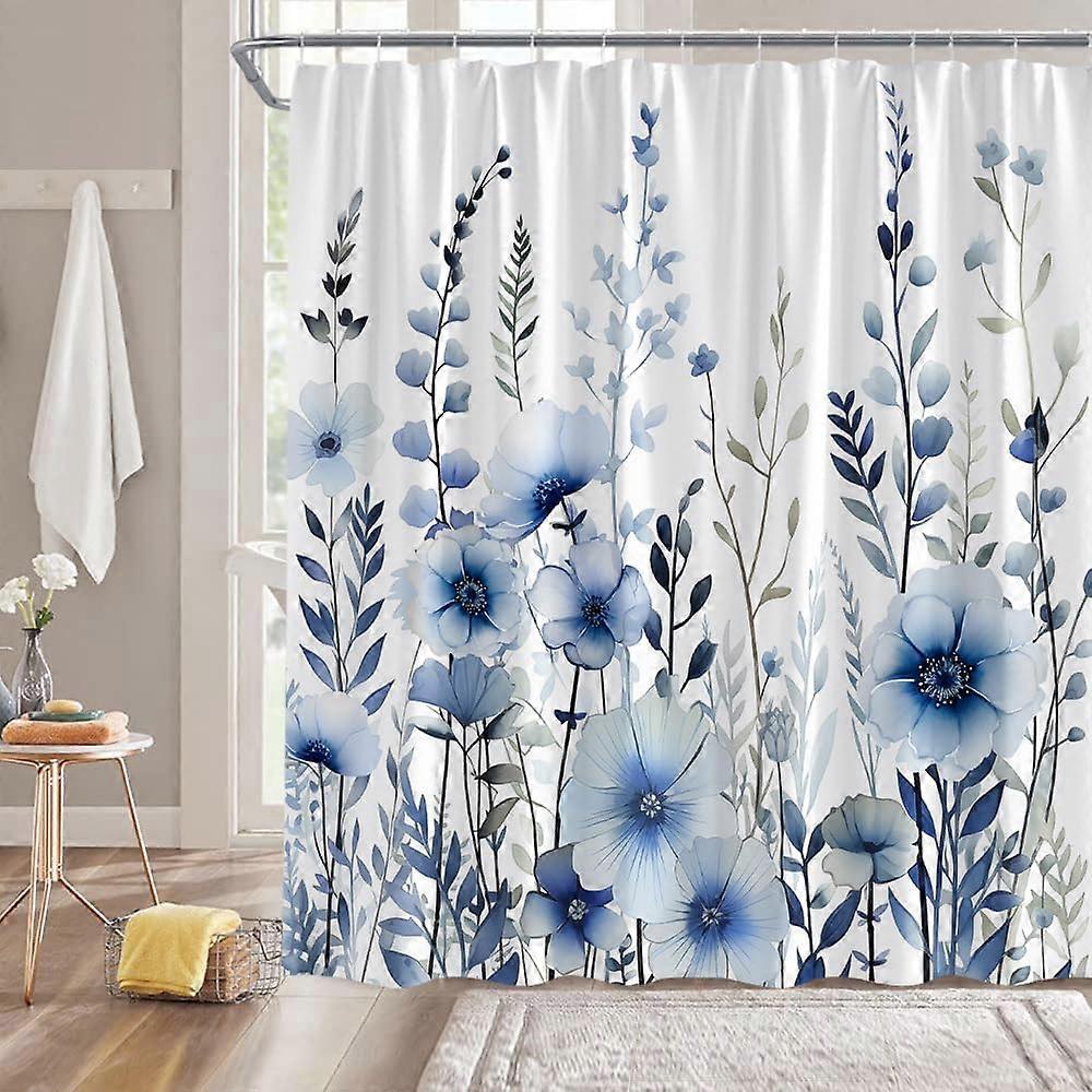 Blue Floral Shower Curtain Rustic Watercolor Flower Leaves Vintage Plant Botanical Nature Spring Modern Aesthetic Fabric Bathroom Decor Curtain with H