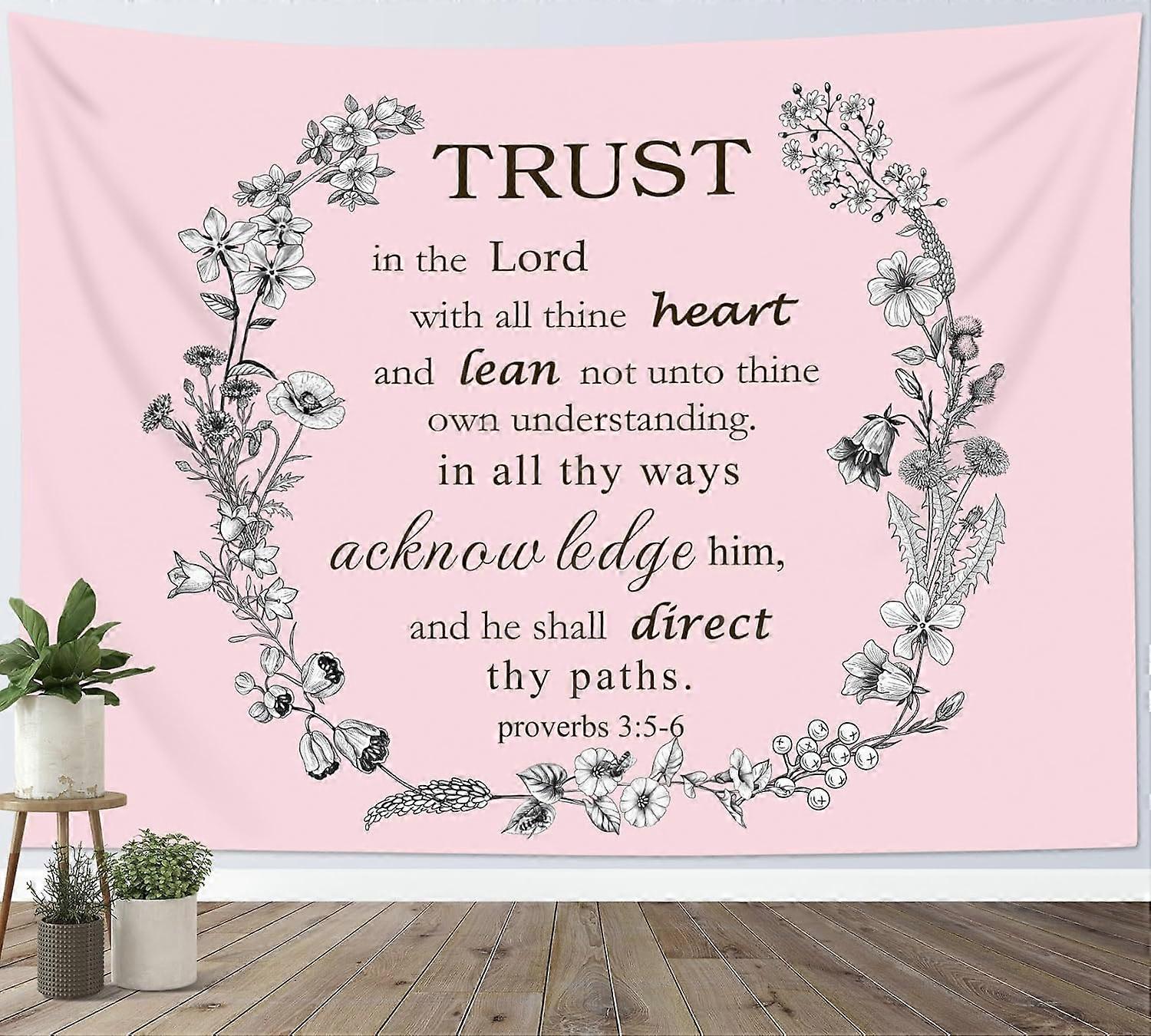 Floral Bible Verse Tapestry Wall Hanging Black and White Flower and Inspirational Quotes on Pink Tapestry Christian Scripture Tapestry for Bedroom Liv