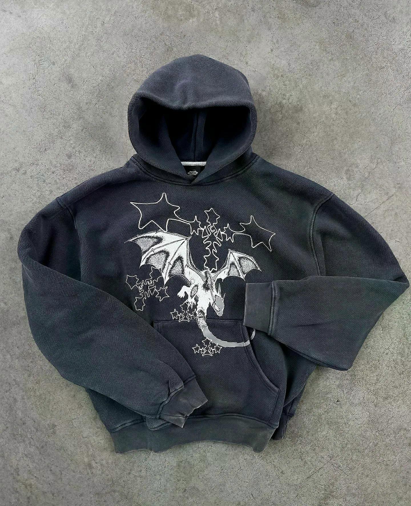 American Hip Hop Vintage Star Dragoon Pattern Print Hoodie Y2k Goth Harajuku Streetwear Pullover Oversized Loose Sweatshirt Men