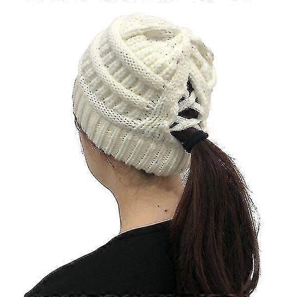 European And American New Cross Ponytail Knitted Hat Back White