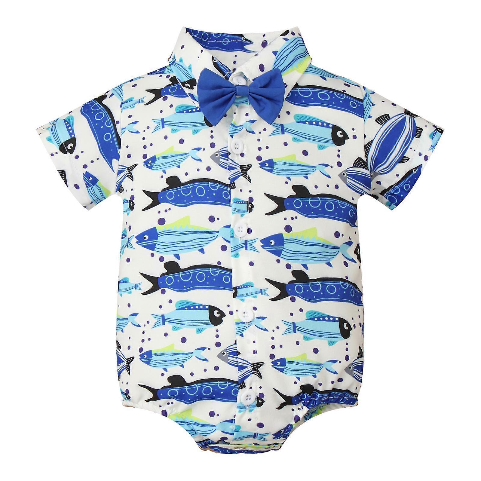 Infant Boys Christening Birthday Gentlemen Rompers Short Sleeve Cartoon Print Formal Bow Tie Bodysuit for Wedding Photography