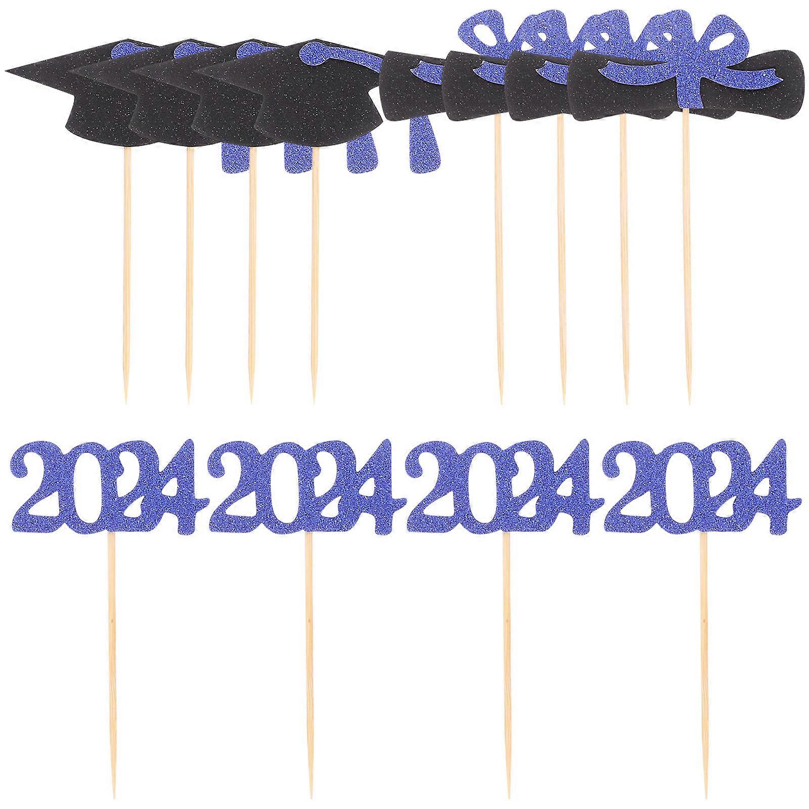Graduation Cupcake Toppers Cap Shape for Celebration Events Blue Paper Wood Party Supplies 12Pcs