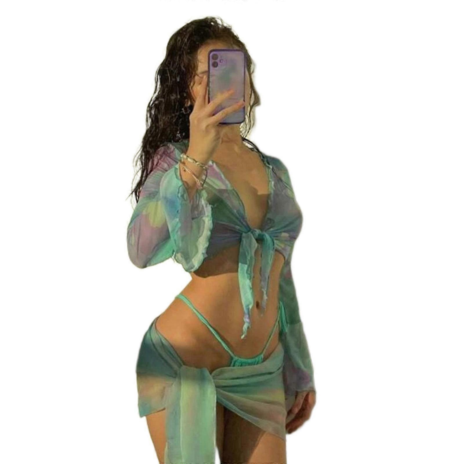Tie Dye 4-piece Knotted Swimming Suit Wrap Beachwear Gather Bikini For W/ Cover