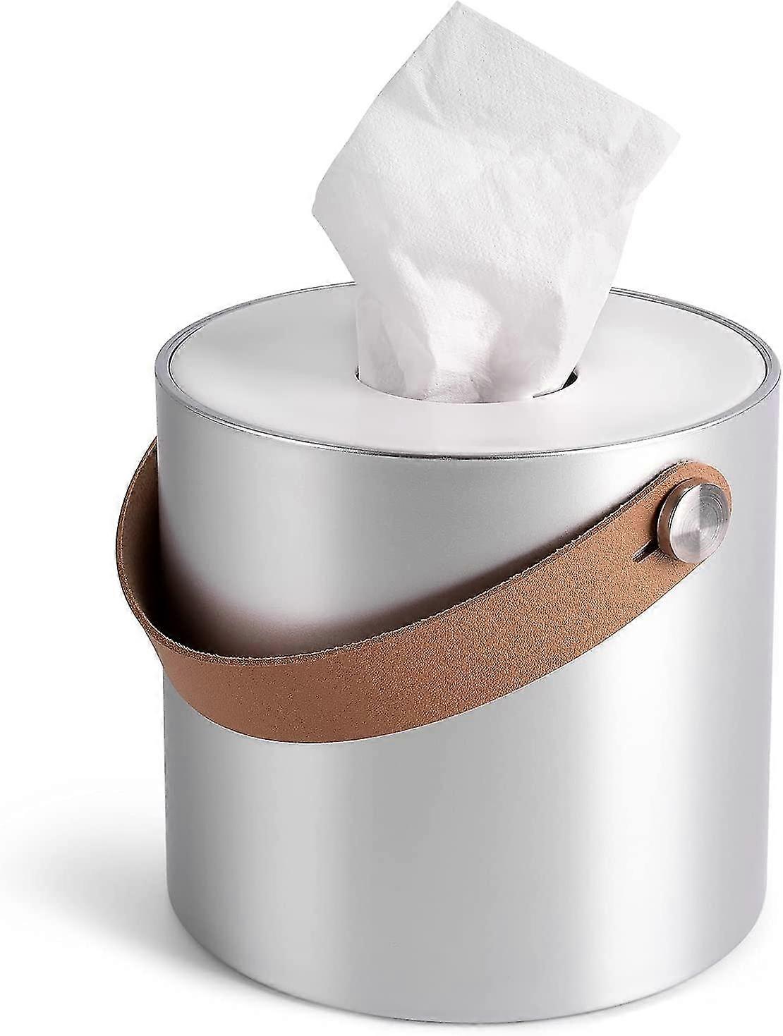 Modern Round Tissue Toilet Paper Dispenser Holder Plastic Box Cover Napkin Organizer With Leather Handles For Bathroom Vanity Tops, Dressers, Bedside