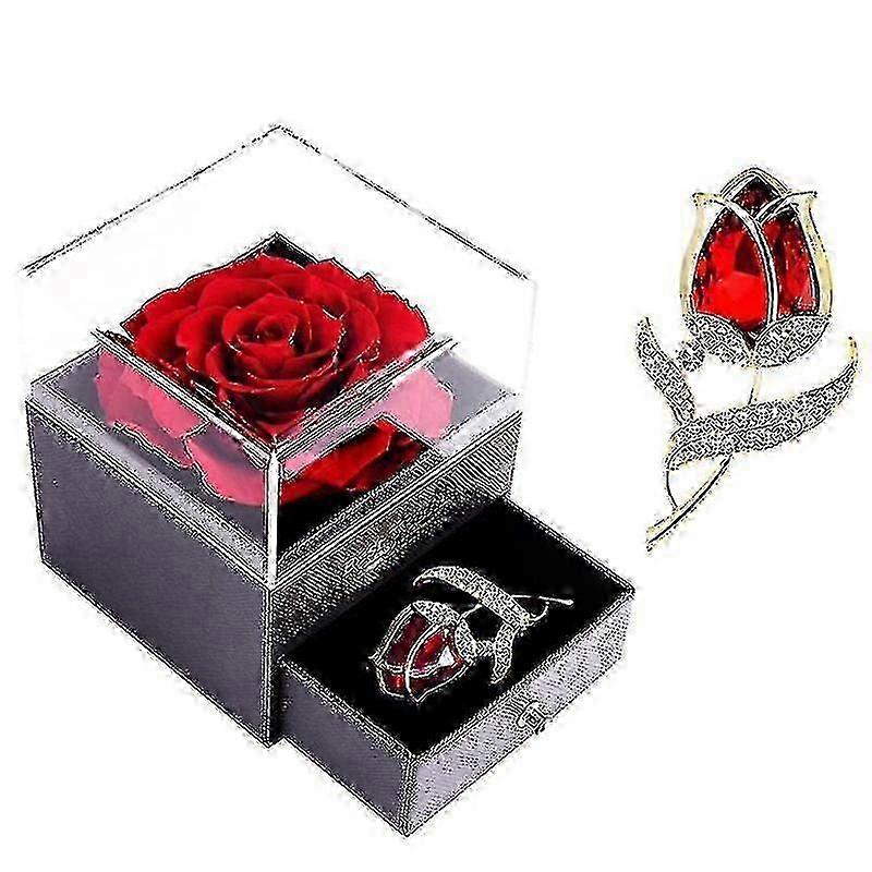 Preserved Real Rose Gift Box,eternal Single Red Rose In A Box With Rose Brooch,forever Everlasting Rose Flower Women On Mother's Day,red Rose