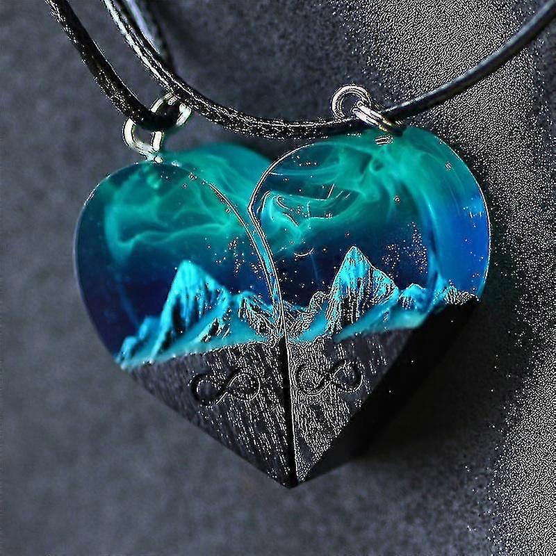 Wood Resin Pairing Heart Pendant Mountain Necklace Couple Birthday Valentine's Day