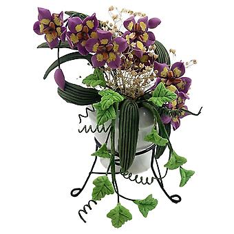 Dolls House Purple Flowers In Large Ceramic Garden Urn & Black Tripod Stand