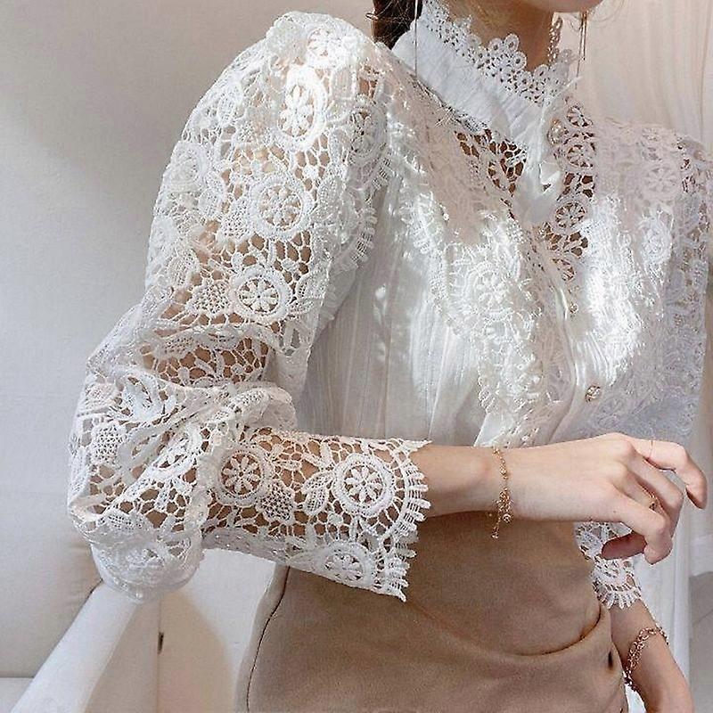 Spring Sweet Hollow Out Lace Patchwork Blouse Autumn Button White Top Women Blusas Petal Sleeve Flower Stand Collar Shirt 12419
