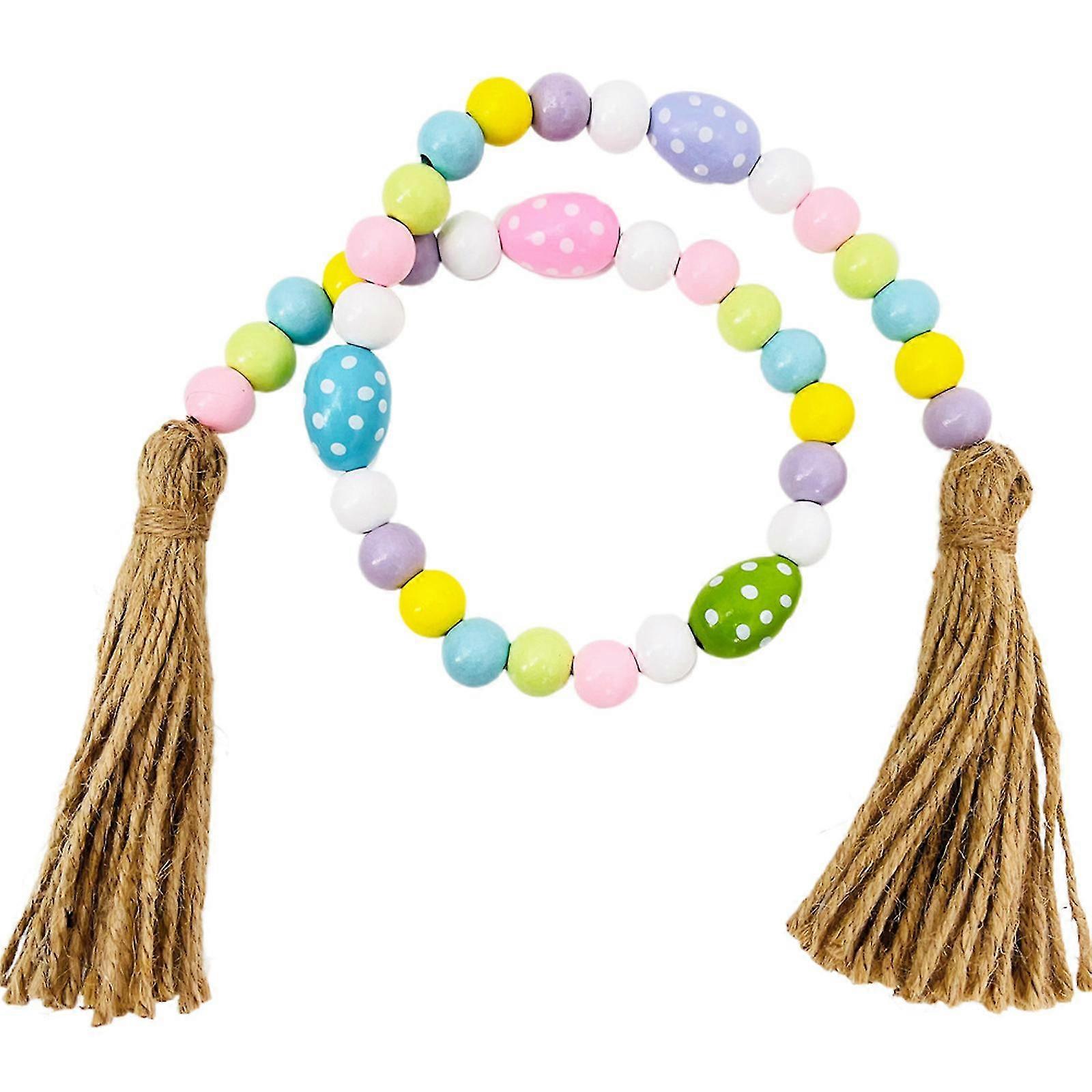 Spring Wooden Beads Garland with Tassels Easter Egg Bead Farmhouse Rustic Tiered Tray Decorations Holiday Country Prayer Boho Bead Shelf Decor