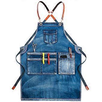 Men Women Denim Work Bib Apron Cross Shoulder Strap Adjustable Shop Aprons with Multi Pockets for Nail Art Salon Barber