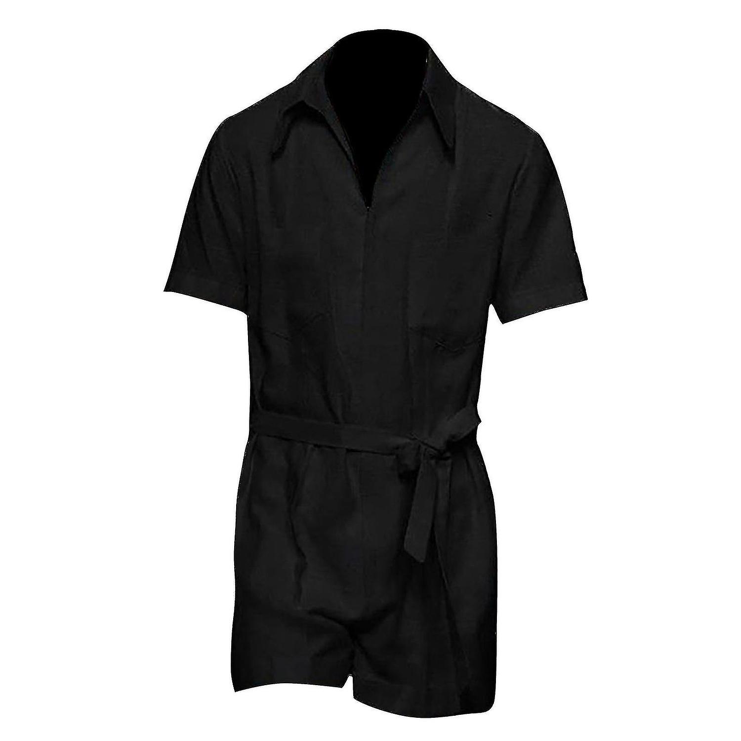 Men's jumpsuit summer solid color slim fit cotton and linen suit drawstring jumpsuit