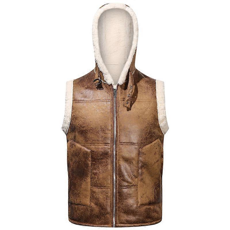 Men's Faux Leather Jacket, Sleeveless Fleece Hooded Outwear Vest For Winter Men Clothes