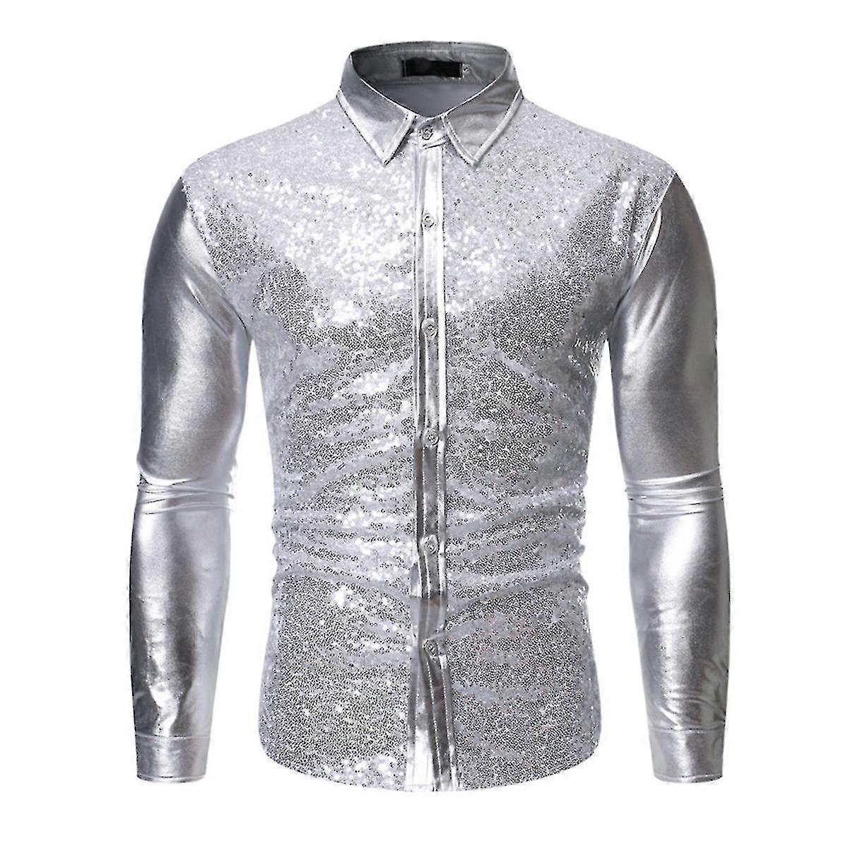 Men's Shinny Sequins Splicing Lapel Long Sleeve Shirt Casual Slim Fit Prom Party Shirt
