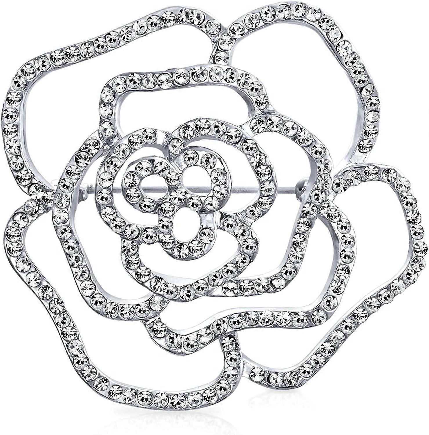 Bridal Pave Cubic Zirconia CZ Large Flower Rose Brooch Pin for Women Silver Plated Brass