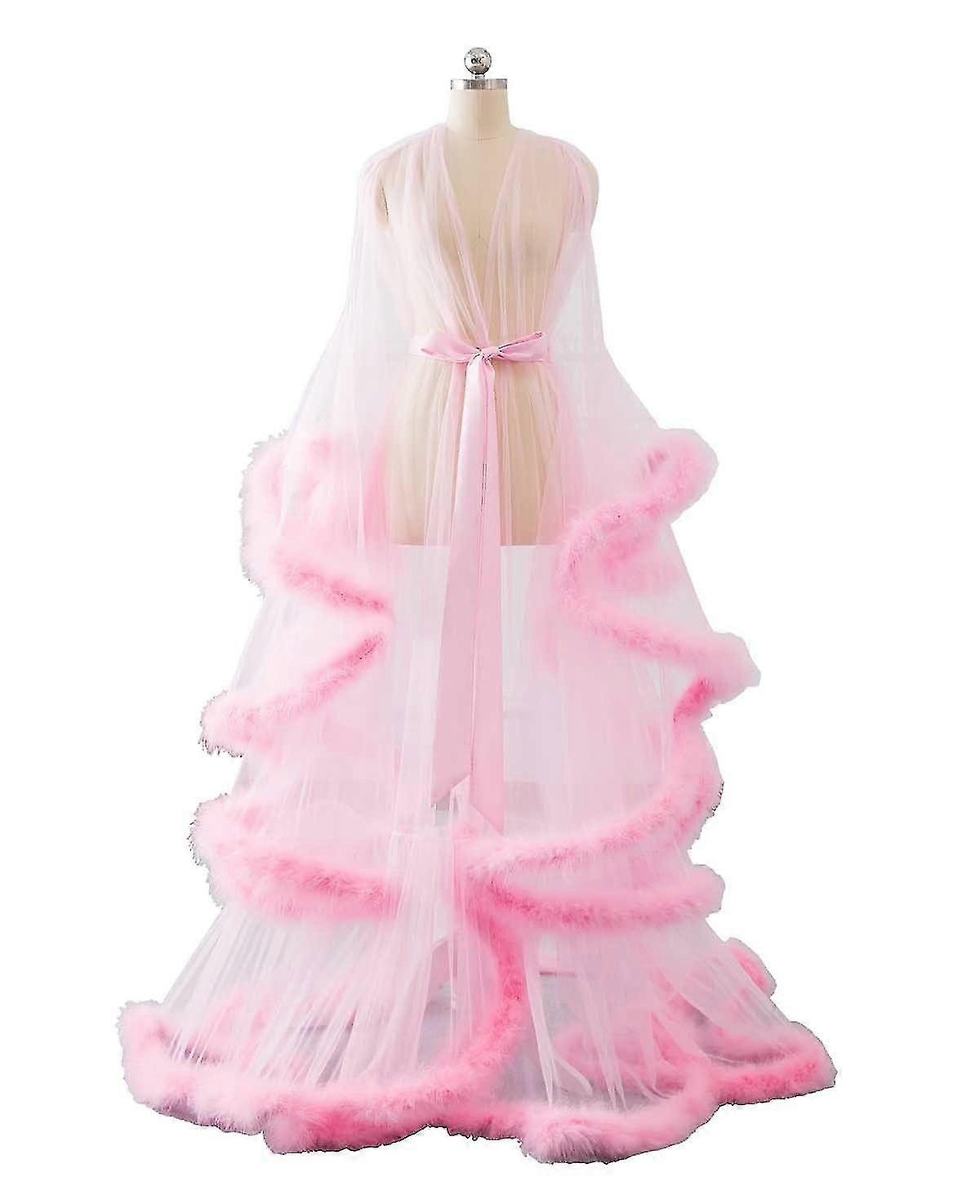 Bridal Boudoir, Feather Trim Sheer, Tulle Illusion, Long Robe Dress Set-3