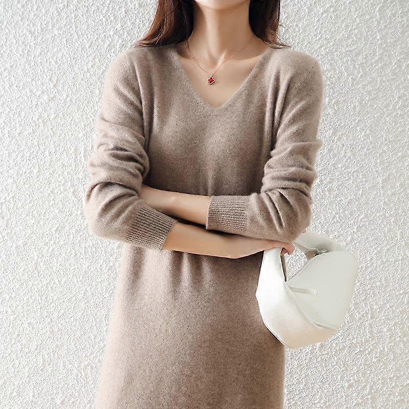 wool dress women's autumn and winter V-neck slim pullover sweater skirt over-the-knee knitted bottoming long skirt bottoming skirt