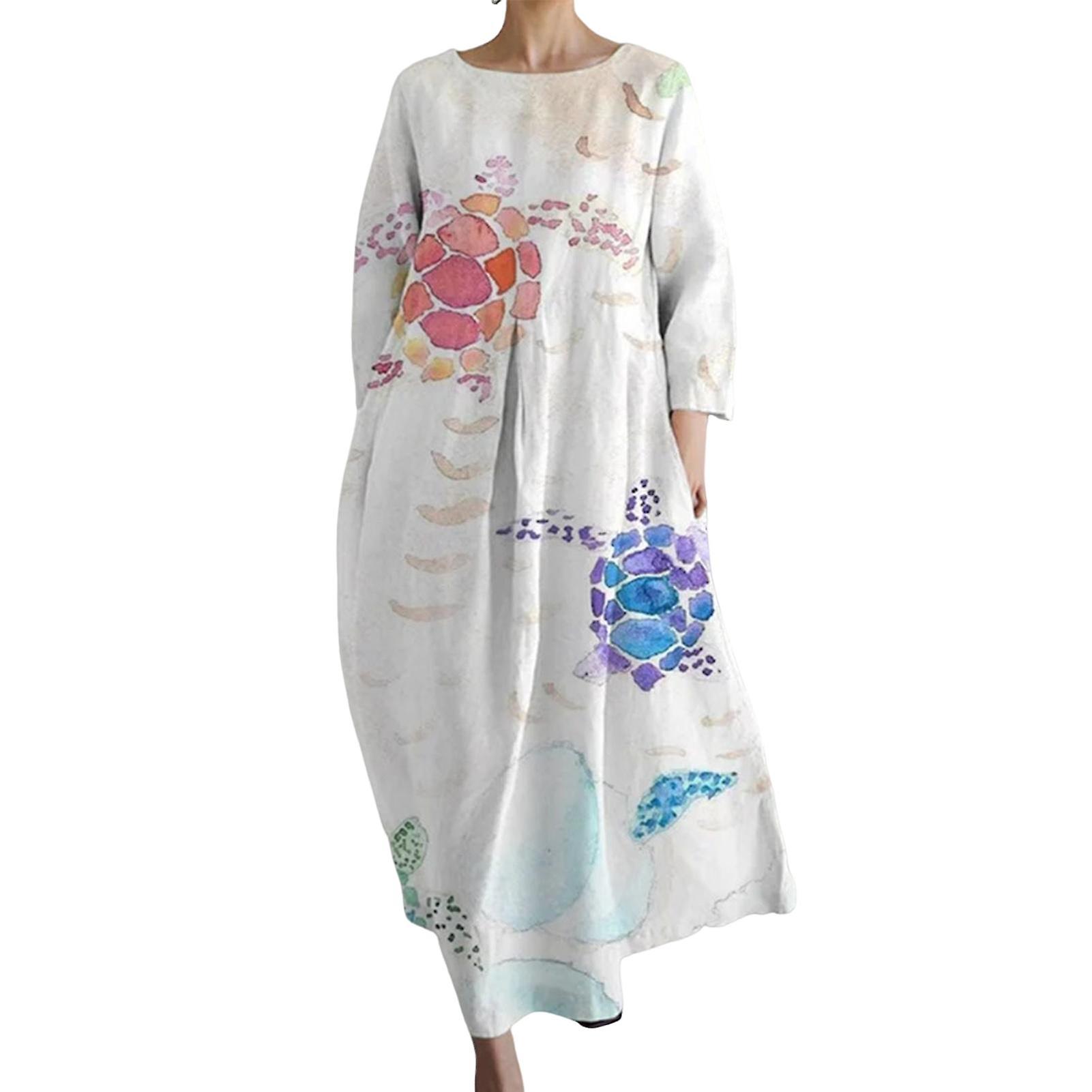 Summer Women Maxi Dress Colorful Printing Three Quarter Sleeve Round Neck Loose A-line Big Hem Side Pockets Vacation Daily Wear Long Dress