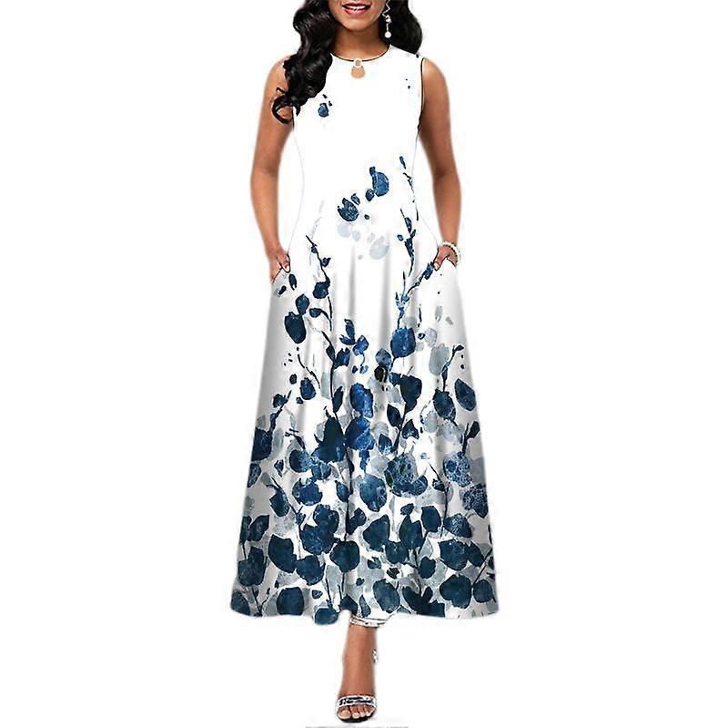 Summer Print Sleeveless Long Dress Round Neck Short Sleeve Pocket Dress