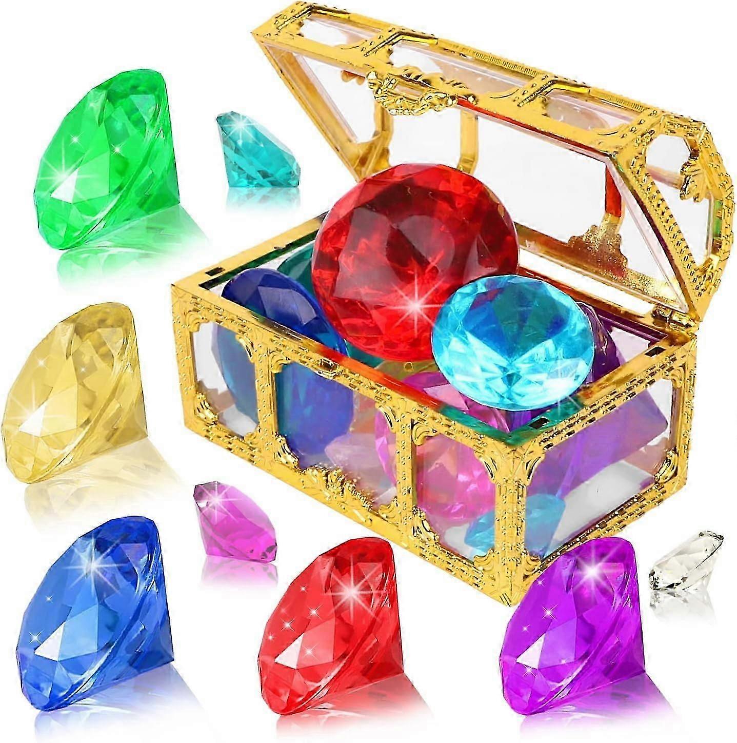 Diving Gem Pool Toys 10 Colorful Big Diamond Gem with Treasure Pirate Chest Box Summer Underwater Sinking Dive Throw Toy Acrylic Gemstones Set for Swi