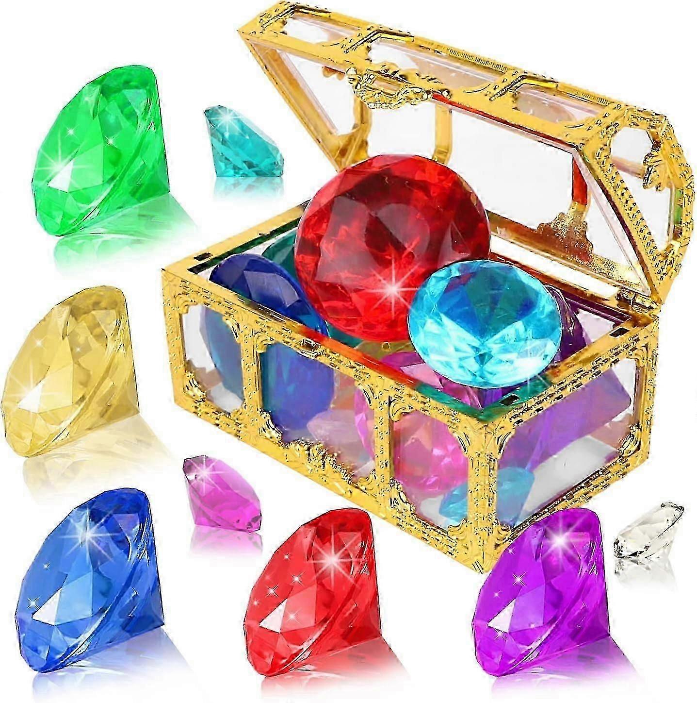 Diving Gem Pool Toys 10 Colorful Big Diamond Gem with Treasure Pirate Chest Box Summer Underwater Sinking Dive Throw Toy Acrylic Gemstones Set for Swi