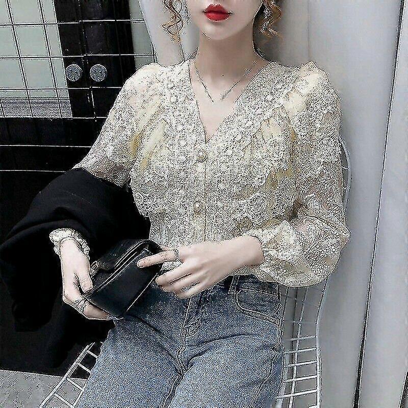 Ruffles Women Lace Embroidery Blouse Shirts Mesh Tops T-shirts Beaded V-neck