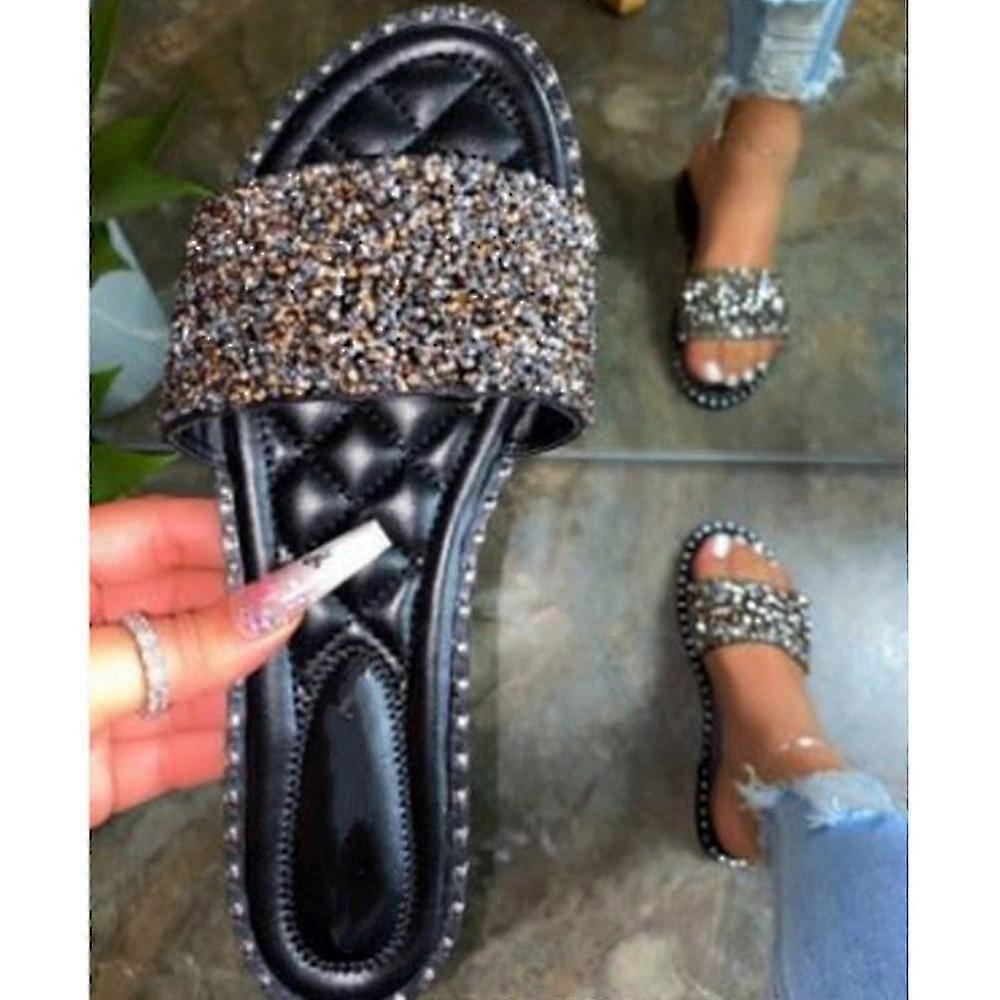 Women Slip On Sliders Flat Slippers Sparkly Diamante Bling Summer Sandals Shoes