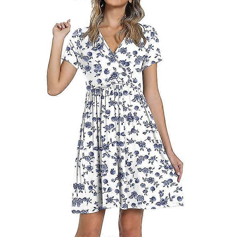 Womens Floral V Neck Mini Dress Ladies Casual Pleated Beach Holiday Party Dress