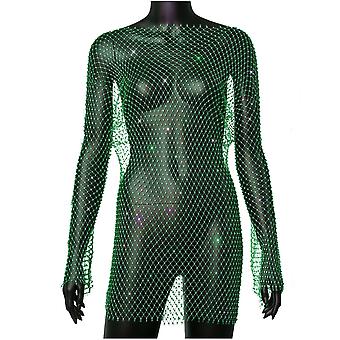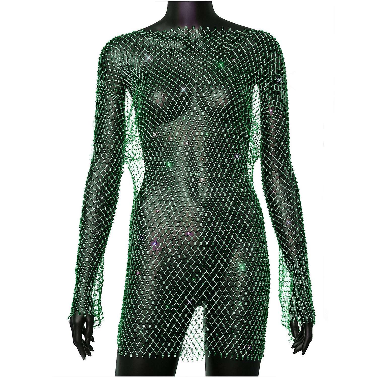 Women Sparkly Rhinestones Fishnet Long Sleev Dress Sexy Mesh See Through Summer Beach Swimwear Bikin