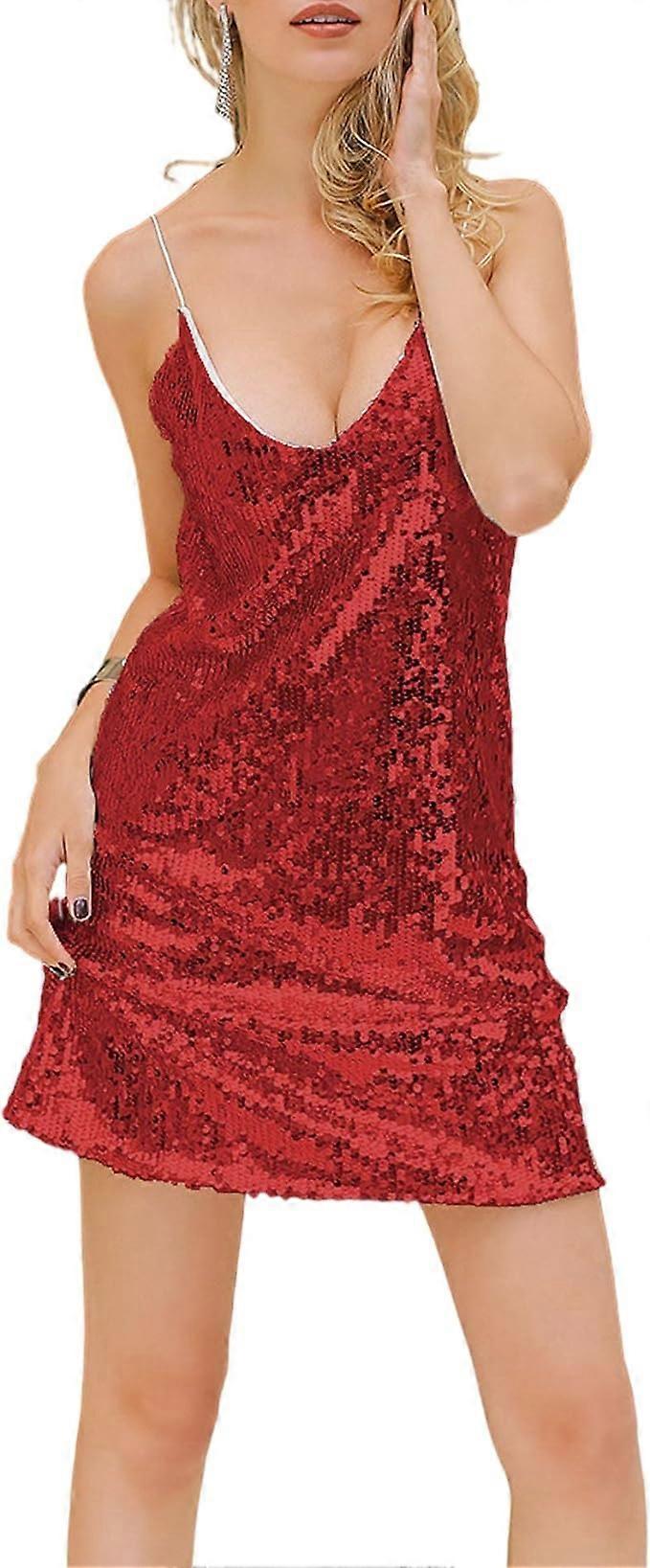 Women's Sequin Mini Dress Spaghetti Strap Glitter Sleeveless V Neck Loose Party Clubwear Mini Dress