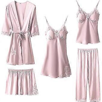 Women's Silk Satin Pajamas Set 5 Pcs Sleepwear Nightgown Cami Shorts Pj Set With Robe And Pant,hw