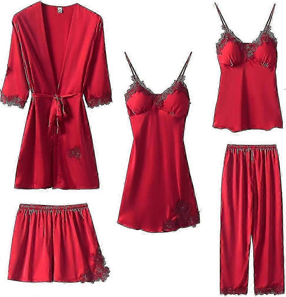 Women's Silk Satin Pajamas Set 5 Pcs Sleepwear Nightgown Cami Shorts Pj Set With Robe And Pant