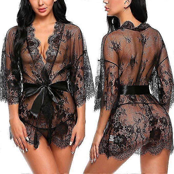 Women's Lace Kimono Robe Babydoll Lingerie Mesh Nightgown