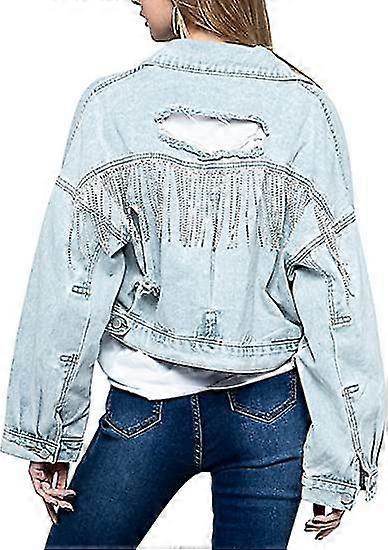 Womens Denim Jacket With Fringe Rhinestones Long Sleeve Distressed Ripped Denim Jackets With Pockets