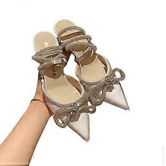 Women's Spring New Pointed Toe High Heels One Word Buckle Rhinestone Bow Casual Shoes