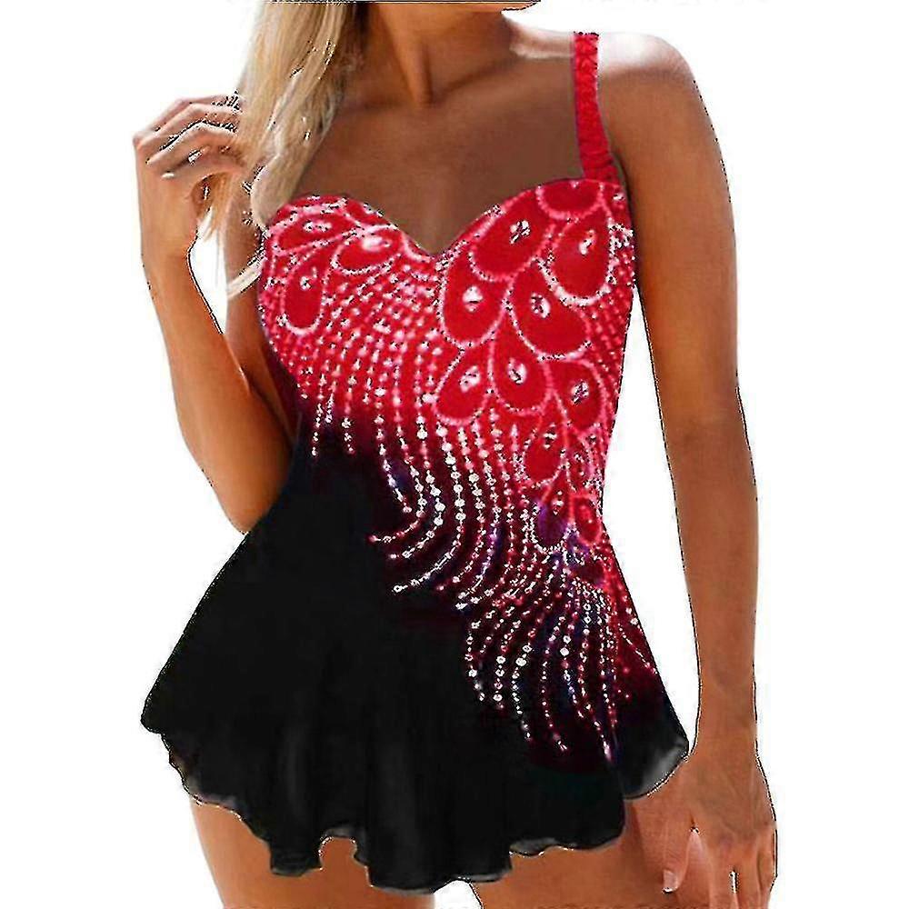 Women Beach Swimwear Feather Print Swimdress Tankini Set Swimsuit Bathing Suit