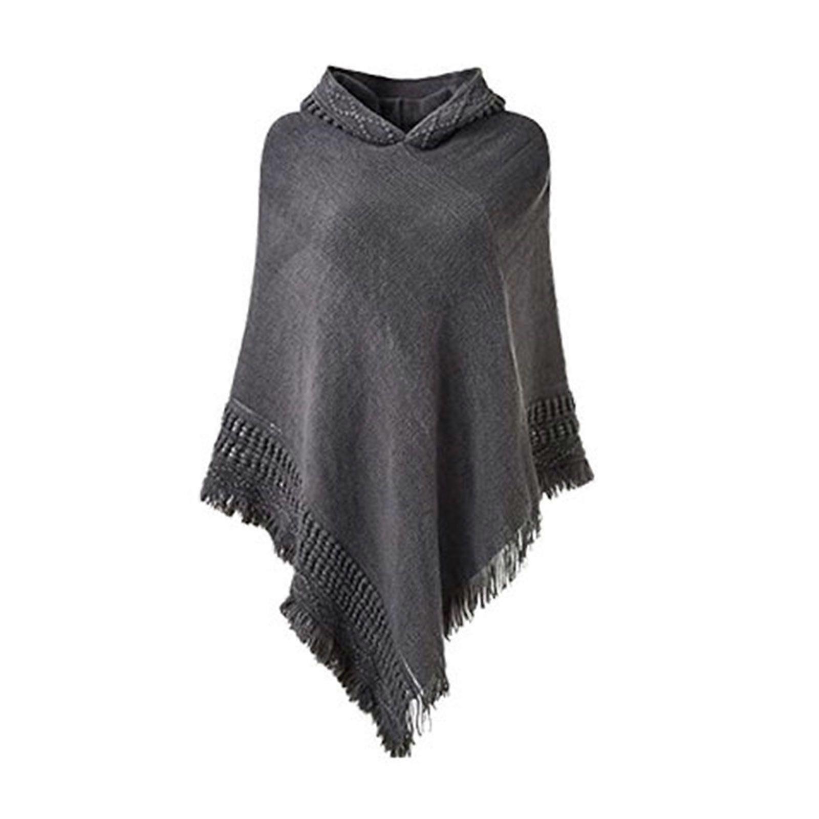 Women Winter Warm Knitted Hooded Poncho Cape Solid Color Crochet Fringed Tassel Shawl Wrap Oversized Pullover Cloak Sweater Top