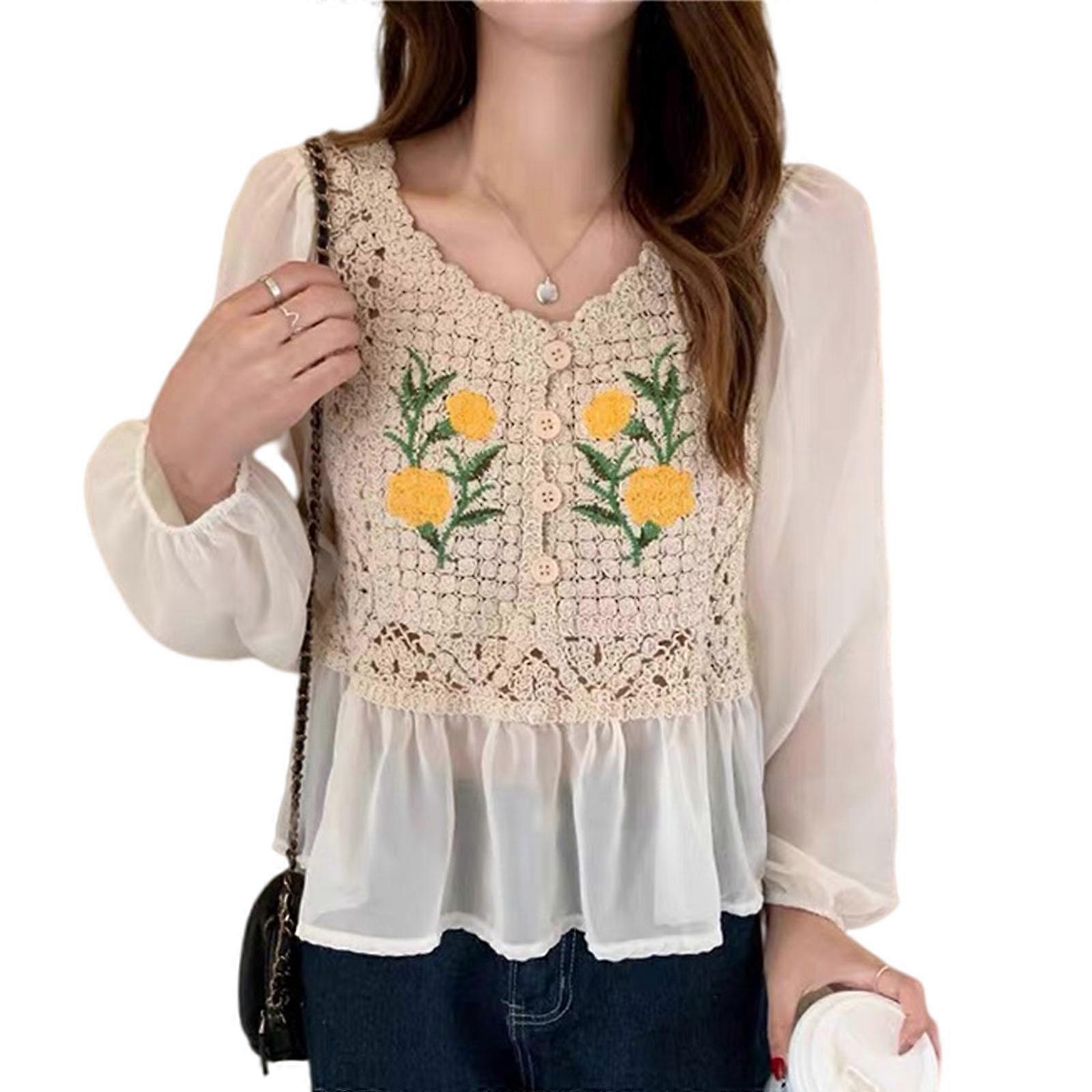 Women Chiffon Puff Long Sleeve Blouse Square Neck Crochet Knit Floral Embroidery Splicing Shirts Ruffle Hem Peplum Top