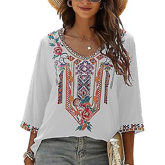 Women's Summer Boho Embroidery Mexican Bohemian Tops V Neck 3/4 Sleeve Causal Loose Shirt Blouse Tun