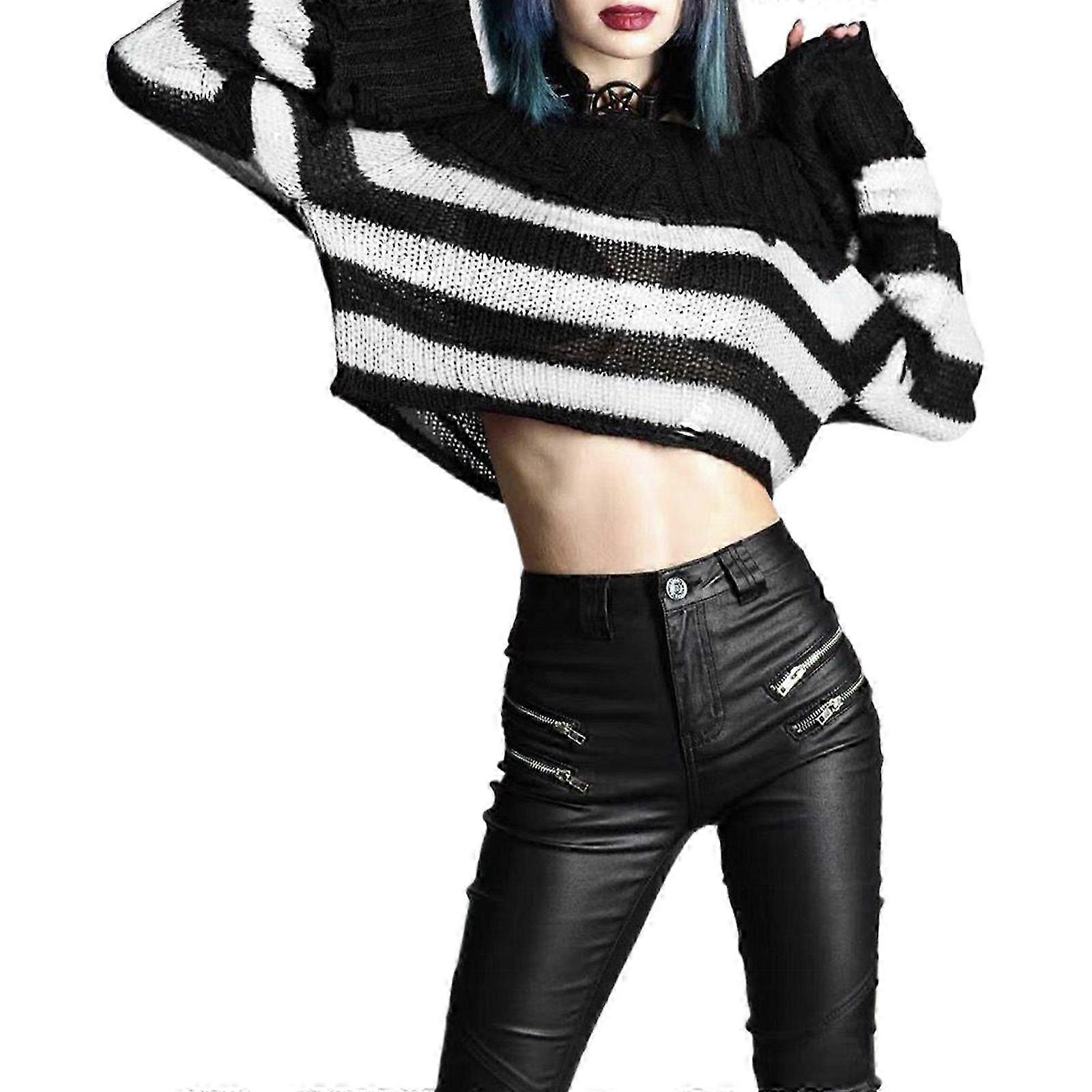 Women Gothic Punk Flare Long Sleeve Sweater Off Shoulder Striped Ripped Holes Loose Knitted Pullover Jumpers Crop Top Purple black
