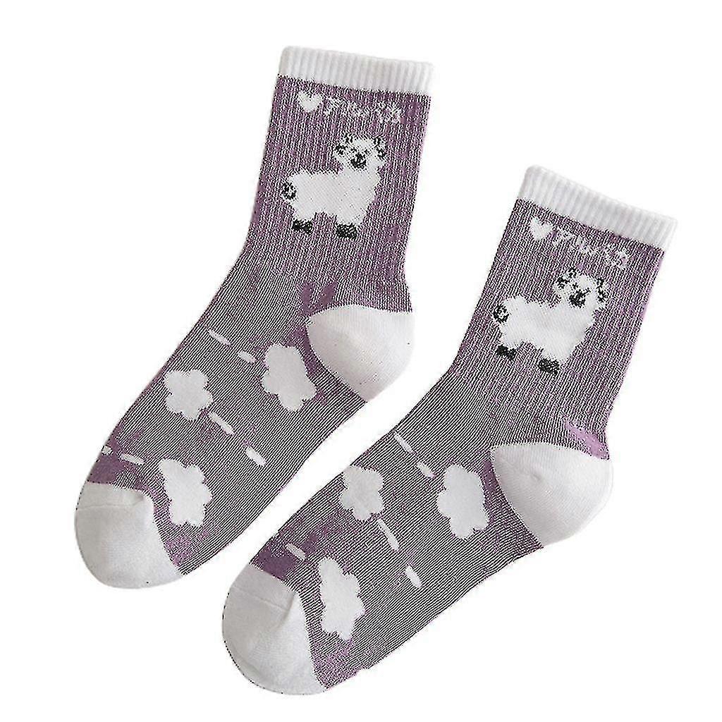Women Cartoon Cotton Crew Socks White Purple Cute Sheep Print Striped Hosiery