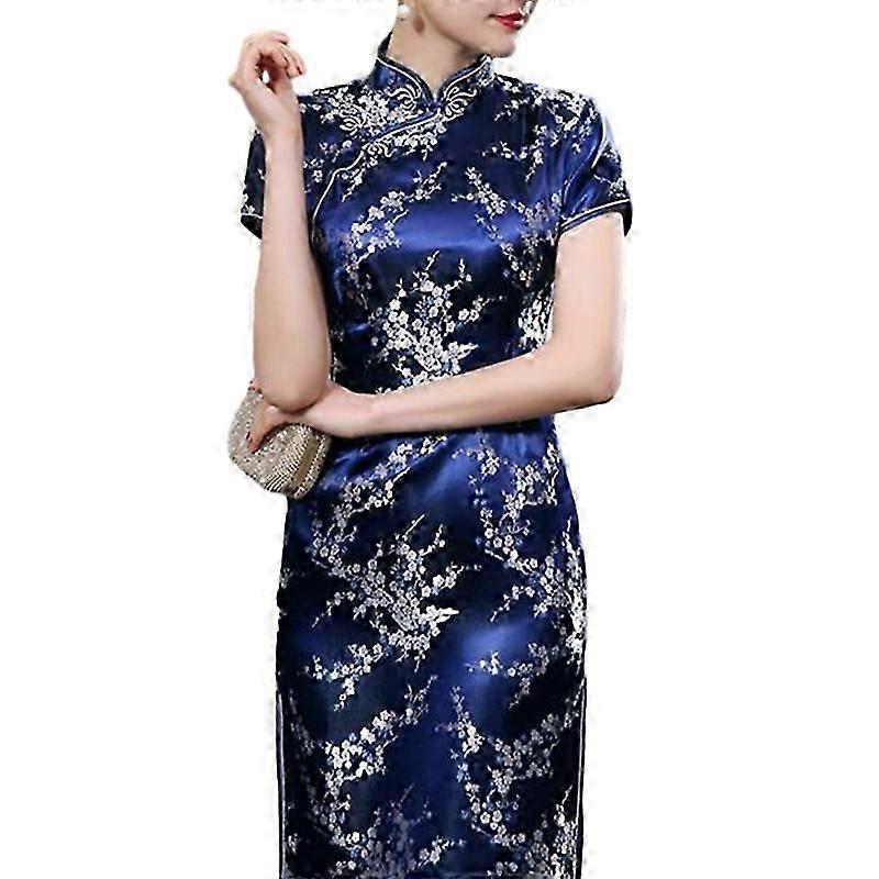 Women Dress Chinese National Style Floral Embroidery Stand Collar Short Sleeves High Side Split Chinese Knot Buttons
