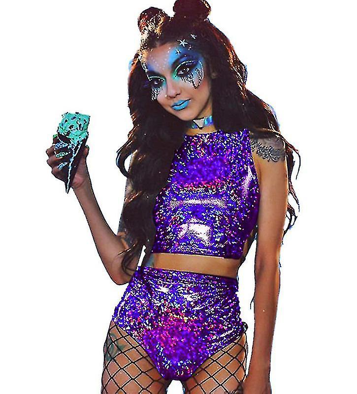 Women Rave Holographic Bodysuit, 2 Piece Metallic Silver For Dance Party Clubwear