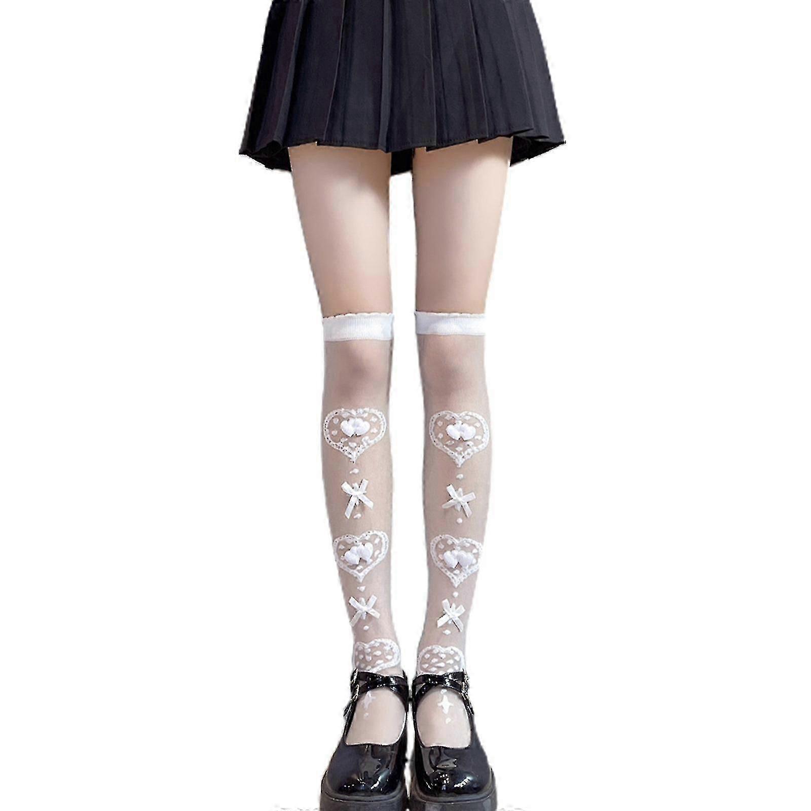 Japanese Women Lolita Glass Fiber Thigh High Stockings Sweet Lace Heart Jacquard Kawaii Bowknot Princess Sheer Mesh Over Knee Long Socks