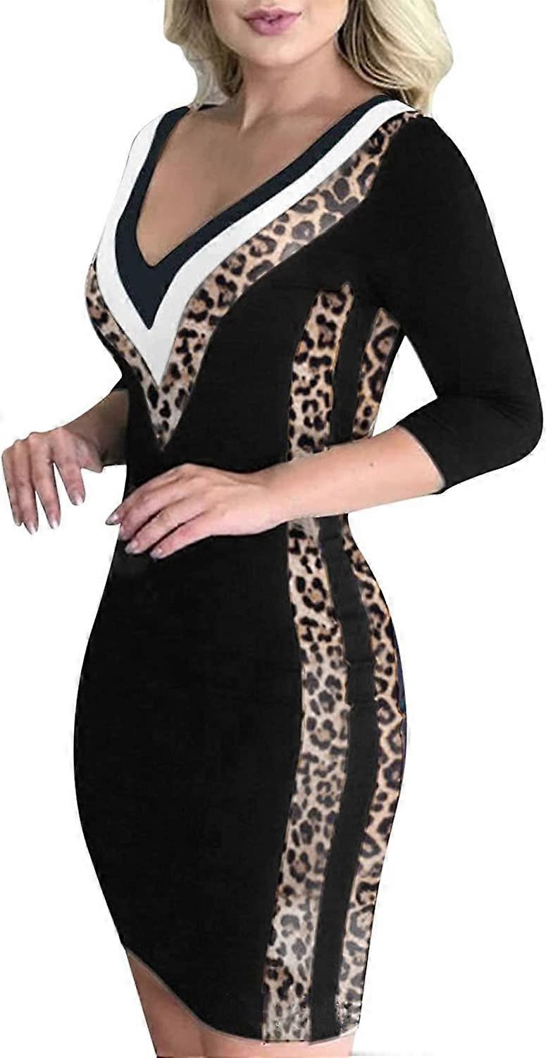 Women's Black And White Stitching Deep V Sexy Package Hip Dress Leopard Print Skirt