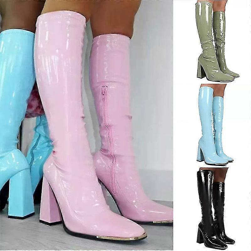 Women Boots Square Heel Patent Leather Pointed Toe Knee High Boots Winter Boot Side Zipper Long
