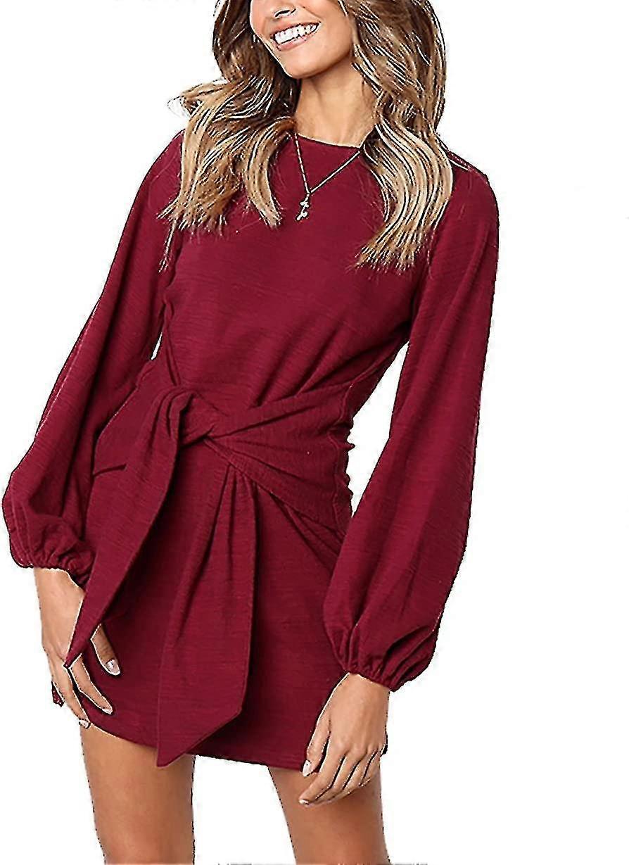 Womens Elegant Long Lantern Sleeve Short Dress Crewneck Tie Waist Knit Cocktail Dress