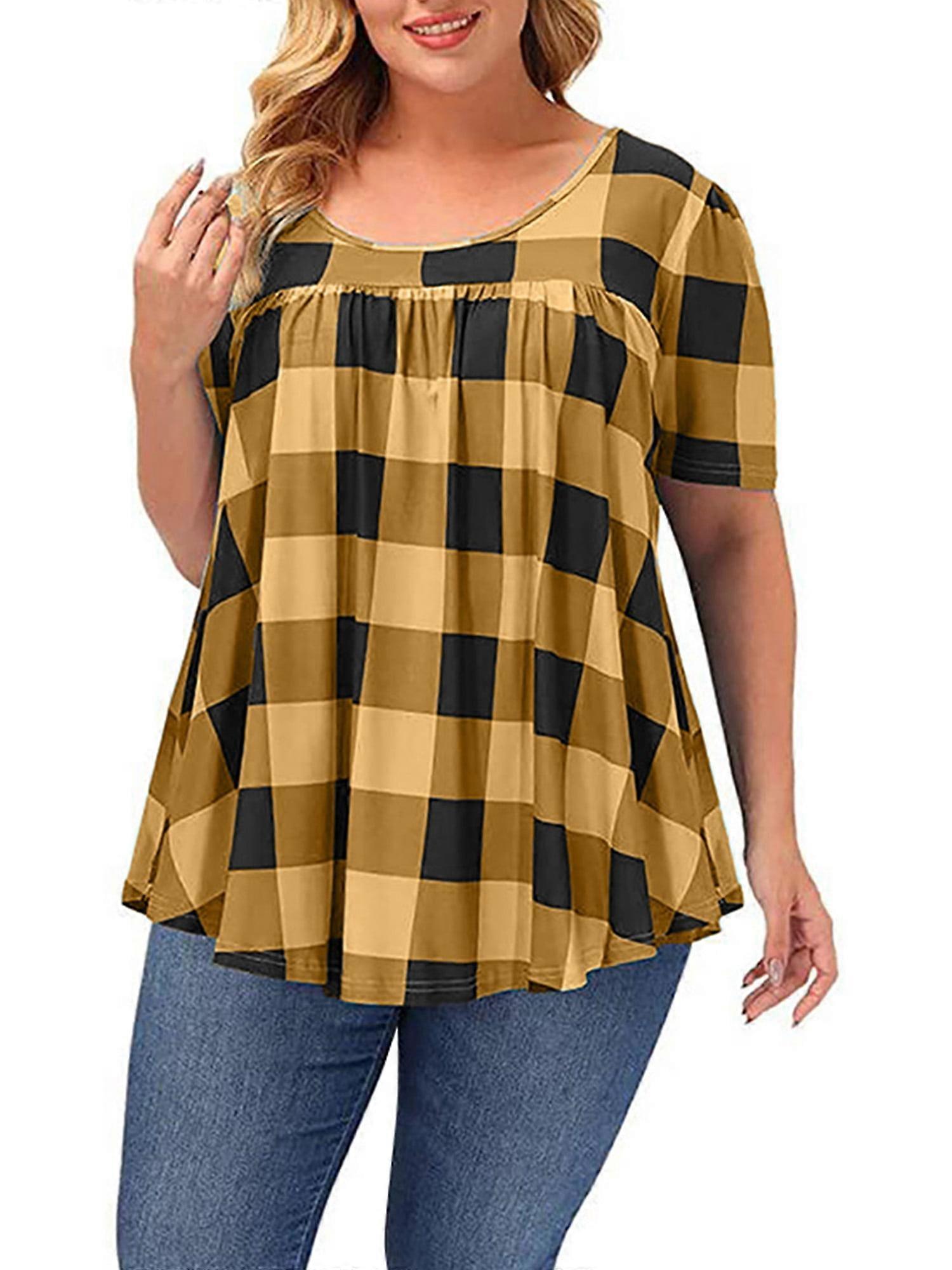 Women's Plus Size Blouses O Neck Short Sleeve Tunic Tops Ruffle Flowy Summer T Shirts Casual Loose Plaid Shirt